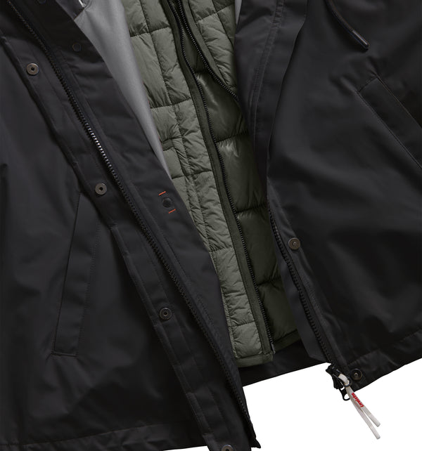 La giacca interna staccabile, unita da cerniere, offre un'isolamento di peso medio con imbottitura sintetica simile al piumino, garantendo calore senza aggiungere volume. Lo strato interno, realizzato con fodera in nylon 100% e tessuto antipiuma, può essere indossato separatamente per una maggiore versatilità. Questa soluzione 2-in-1 garantisce comfort, affidabilità e adattabilità per le esigenze quotidiane.