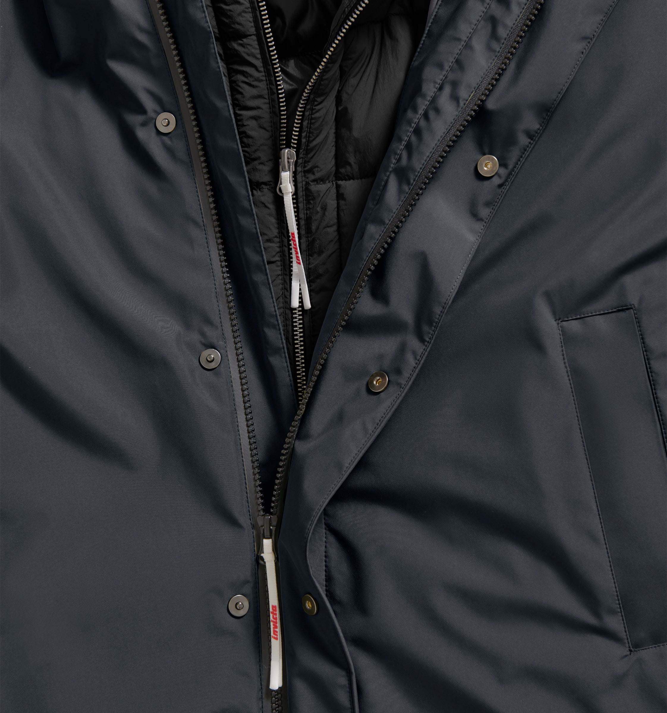 La giacca interna imbottita staccabile si attacca con cerniere nascoste e una chiusura magnetica sul cappuccio. L'imbottitura sintetica PrimaLoft® di peso medio fornisce calore e isolamento senza peso extra. Il design due in uno offre flessibilità: indossa la giacca interna da sola nei giorni più miti o combina entrambi gli strati per un calore aggiuntivo. Ogni dettaglio, dalle cuciture a prova di piuma alla finitura resistente all'acqua, garantisce funzionalità, comfort e stile duraturo.