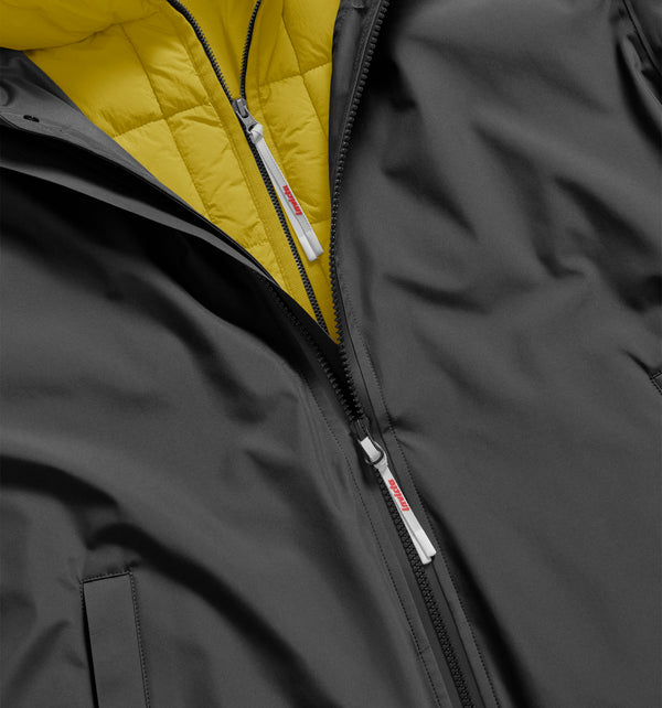 Il giaccone offre protezione antivento e lunga durata. Il gilet interno è imbottito con materiale sintetico di Primaloft®, leggero, caldo e ad asciugatura rapida. Dettagli come i polsini regolabili, le tasche laterali e le linee pulite completano un design pratico e moderno, adatto a diverse condizioni meteo e occasioni.