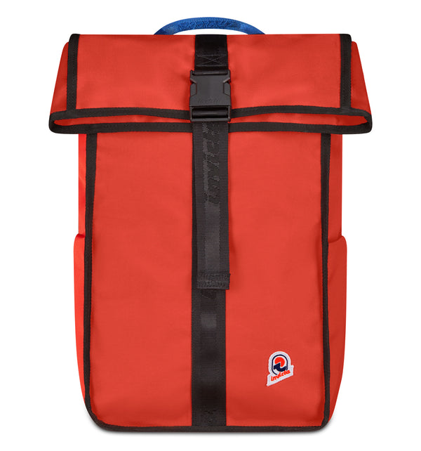 Zaino mono scomparto con chiusura arrotolabile. Portanome personalizzato Invicta incluso, nastri jacquard, patch Invicta ricamato, fibbia e tirazip personalizzati, etichetta interna alta definizione