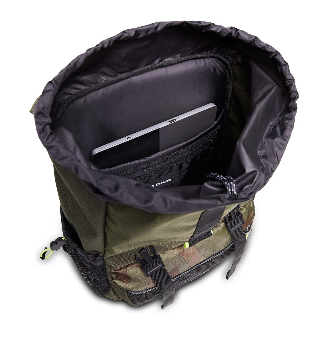 - Scomparto interno imbottito porta laptop fino a 15,6” (fino a 38x26x2cm). Tasca interna con zip. Tasche laterali porta borraccia.