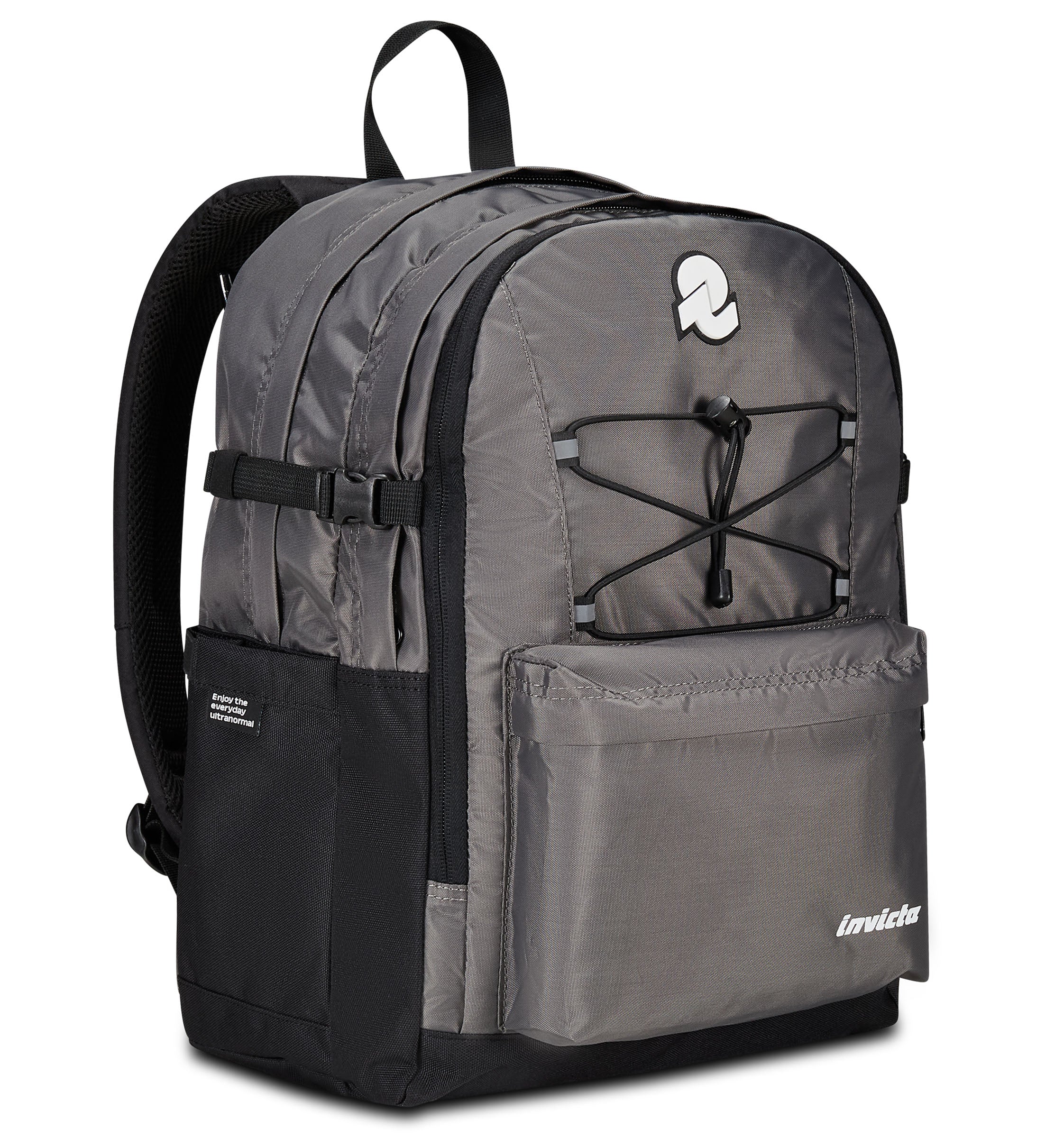 Zaino doppio scomparto con fondo rinforzato, nastri laterali per la regolazione del volume, sistema elastico anteriore con inserti riflettenti, tessuto lucido.