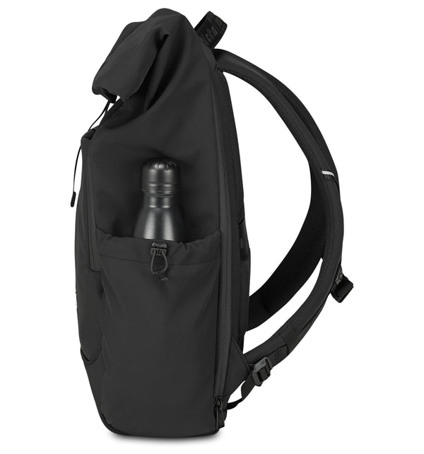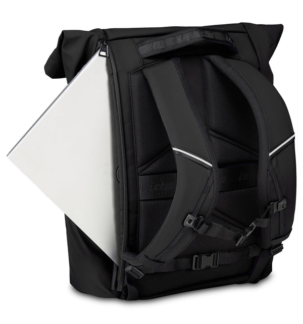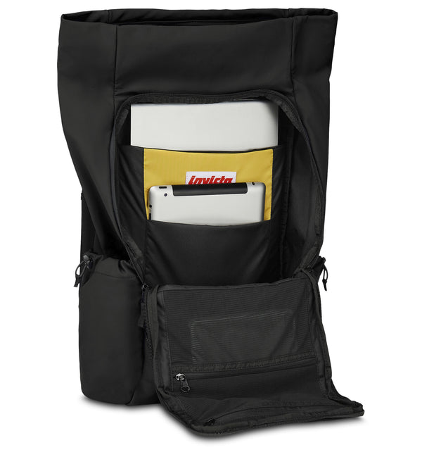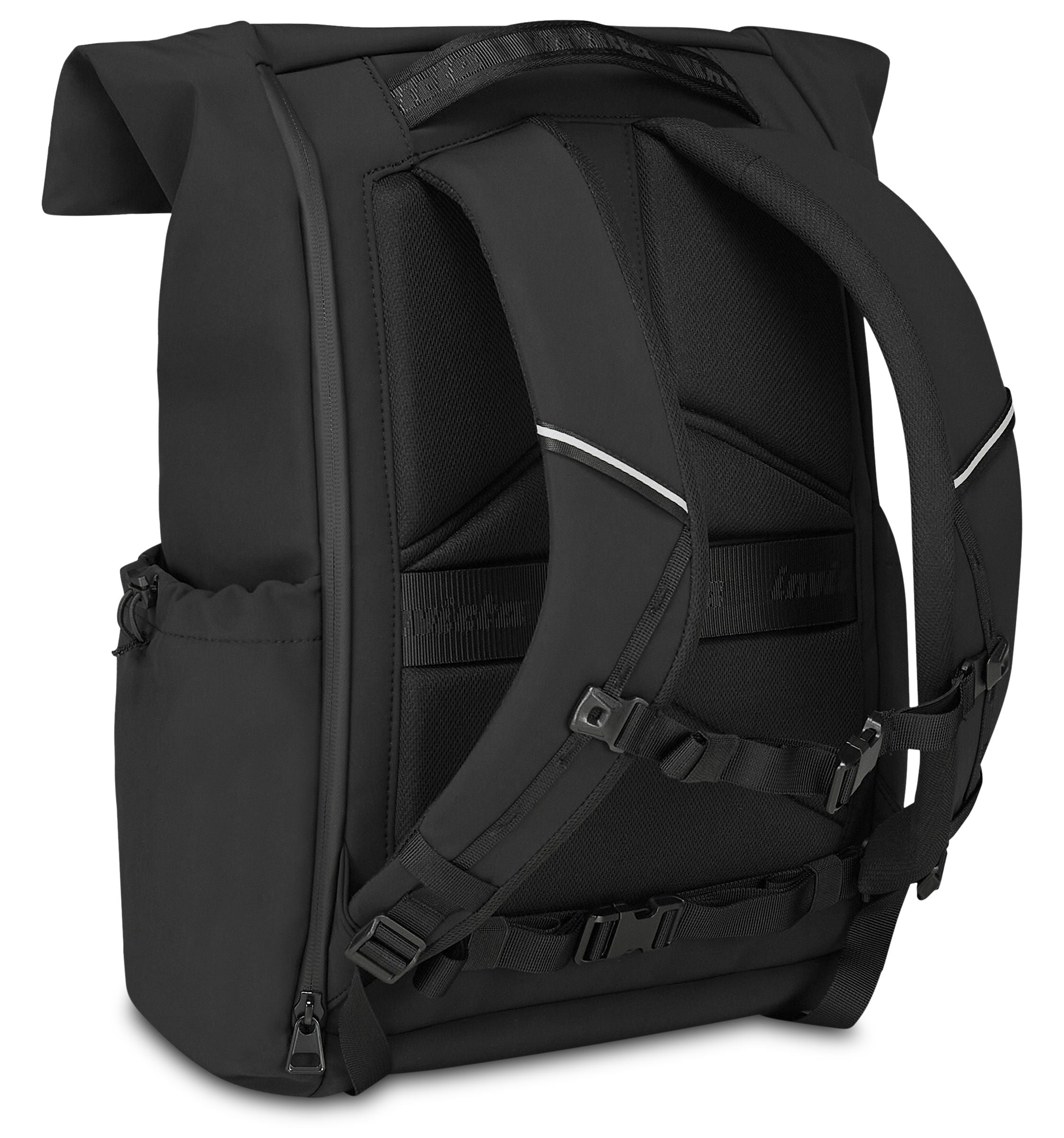 Der Invict-Act Fold Urban ist ein Rolltop-Rucksack mit verstärktem Boden und einem Fassungsvermögen von 24 Litern. Er hat eine praktische zusätzliche Frontöffnung, ein Fach für einen PC bis zu 15,6“, Taschen für Tablet, Wasserflasche, Smartphone, Brille und Zubehör. Er ist ideal für den Stadtverkehr und kann mit dem speziellen Gurt auch auf dem Trolley verstaut werden.