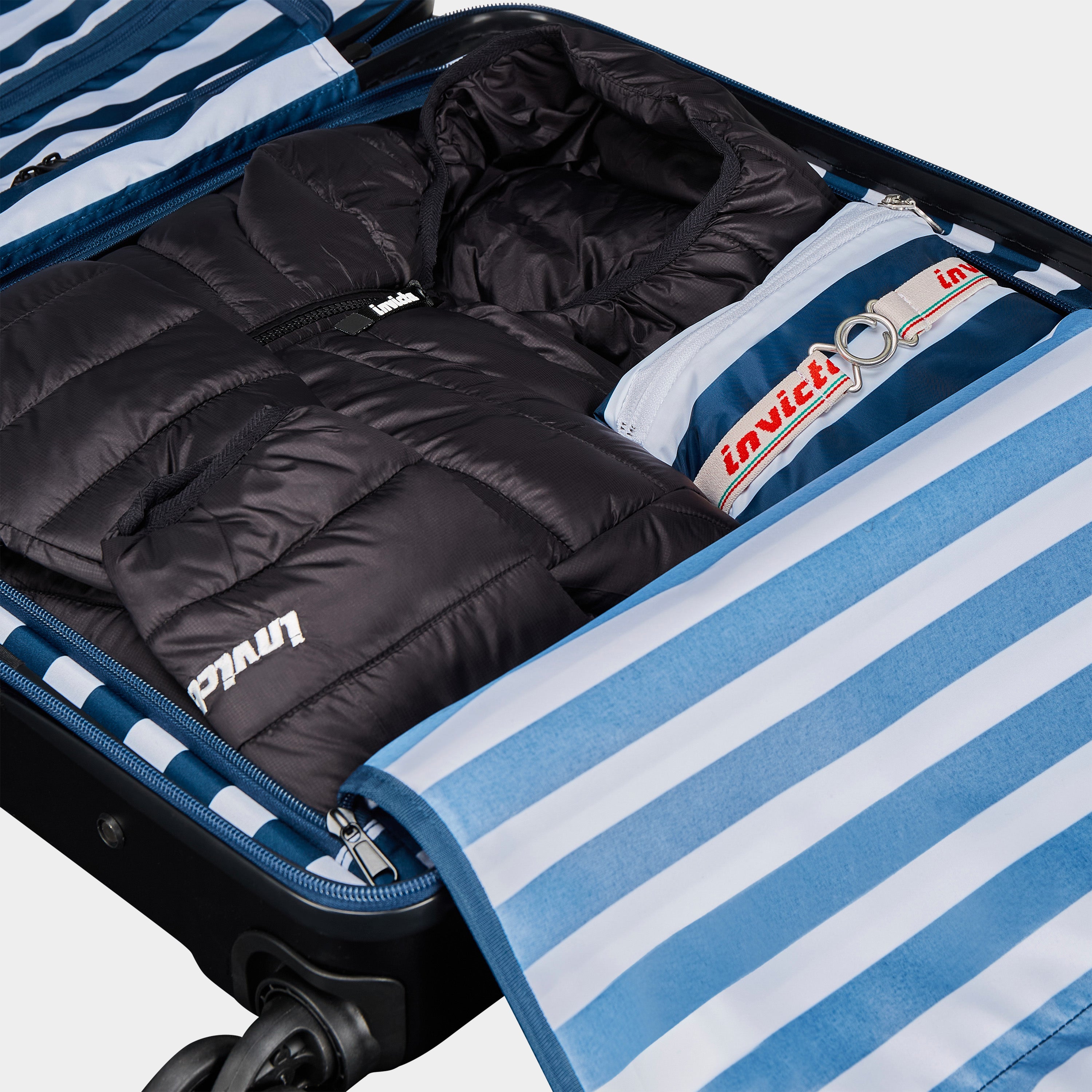 USB-Anschluss mit Innentasche für Powerbank. Integrierter Verschluss in Kombination mit TSA-System. Teleskopgriff mit Doppelstange und verstellbarer Stange. Doppelte 360°-Lenkrollen. Invicta-Anhänger abnehmbar.