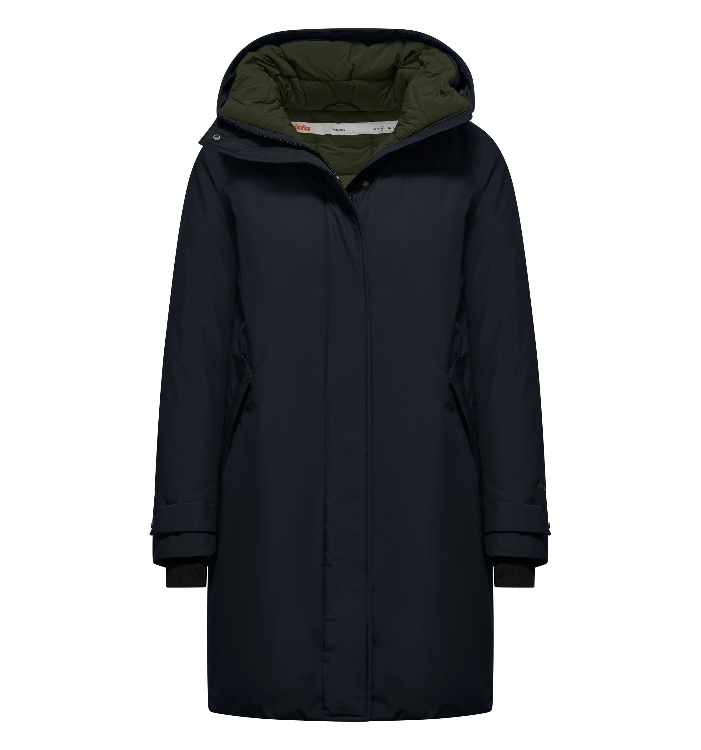 - The women's long parka features a fixed hood and covers from thighs to head.