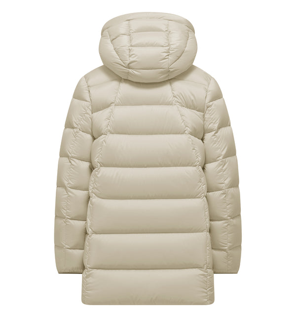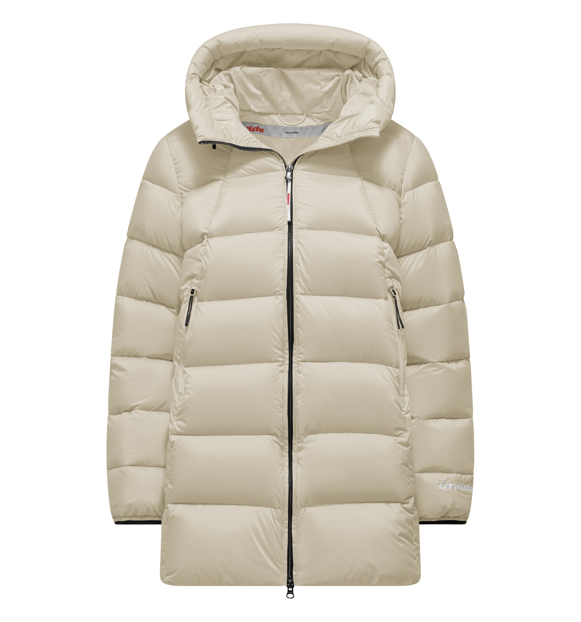 - Long women's down jacket with fixed hood and two-way zipper for adaptable coverage