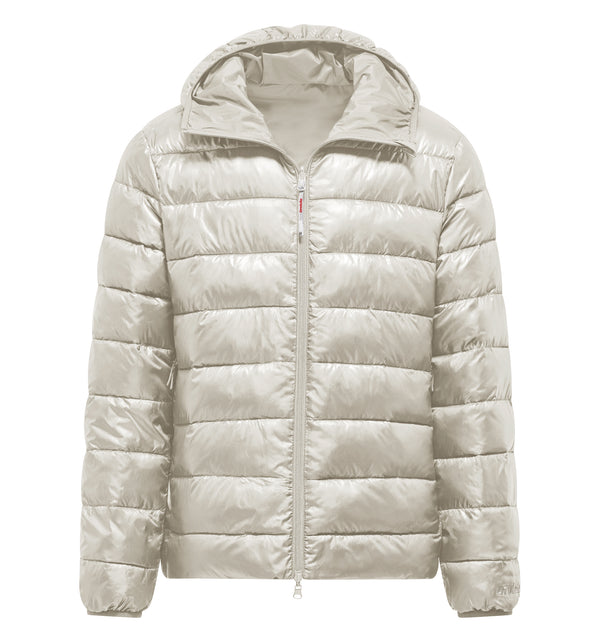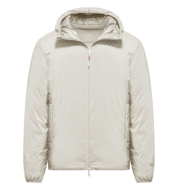 This men's puffer jacket is reversible, so it can be worn on the smooth side or with horizontal quilting, offering two different styles in one garment. The fixed hood and high collar protect against wind and cold, while the two-way zipper ensures practicality and comfort of movement. The regular fit adapts well to different layers, and the lightweight synthetic padding provides warmth without weighing you down. Perfect for the city and leisure time.