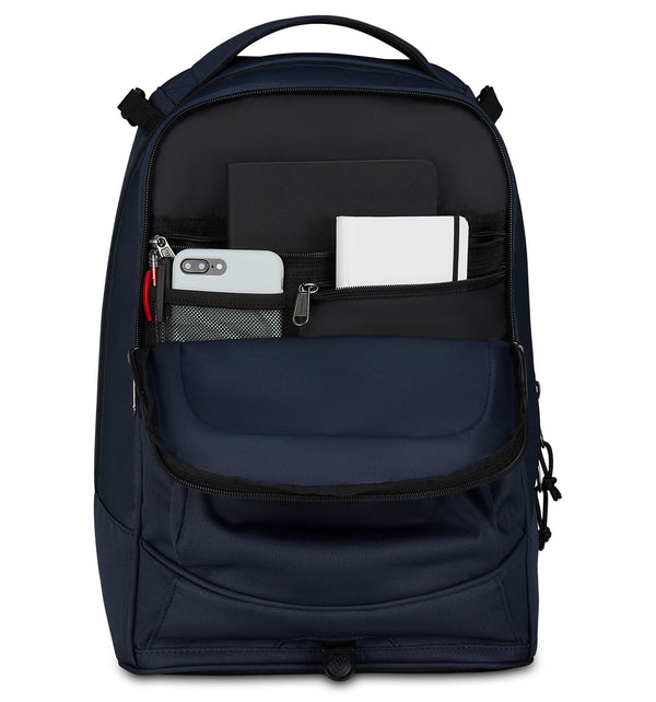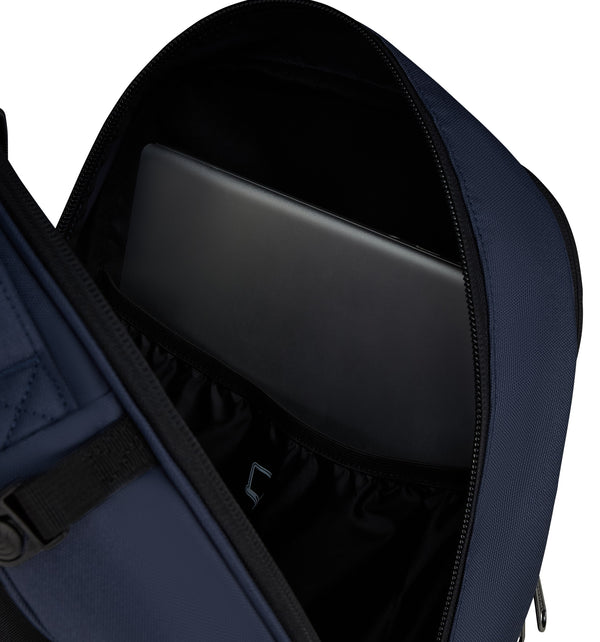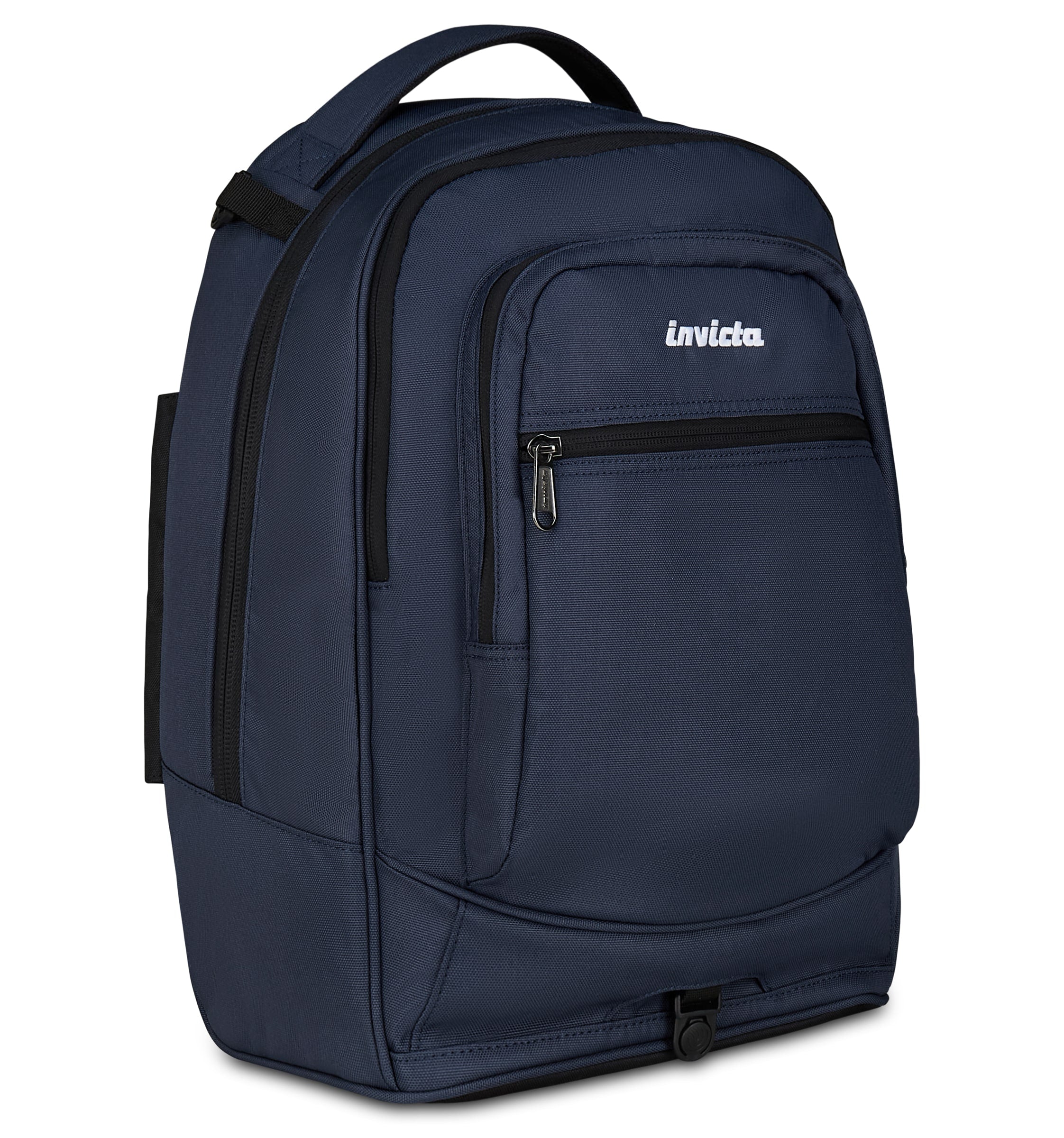 - Double compartment with frontal pocket, side pockets for bottle, utility pocket with organizer, inner laptop pocket 14" (up to 33x22,6x1,8 cm).