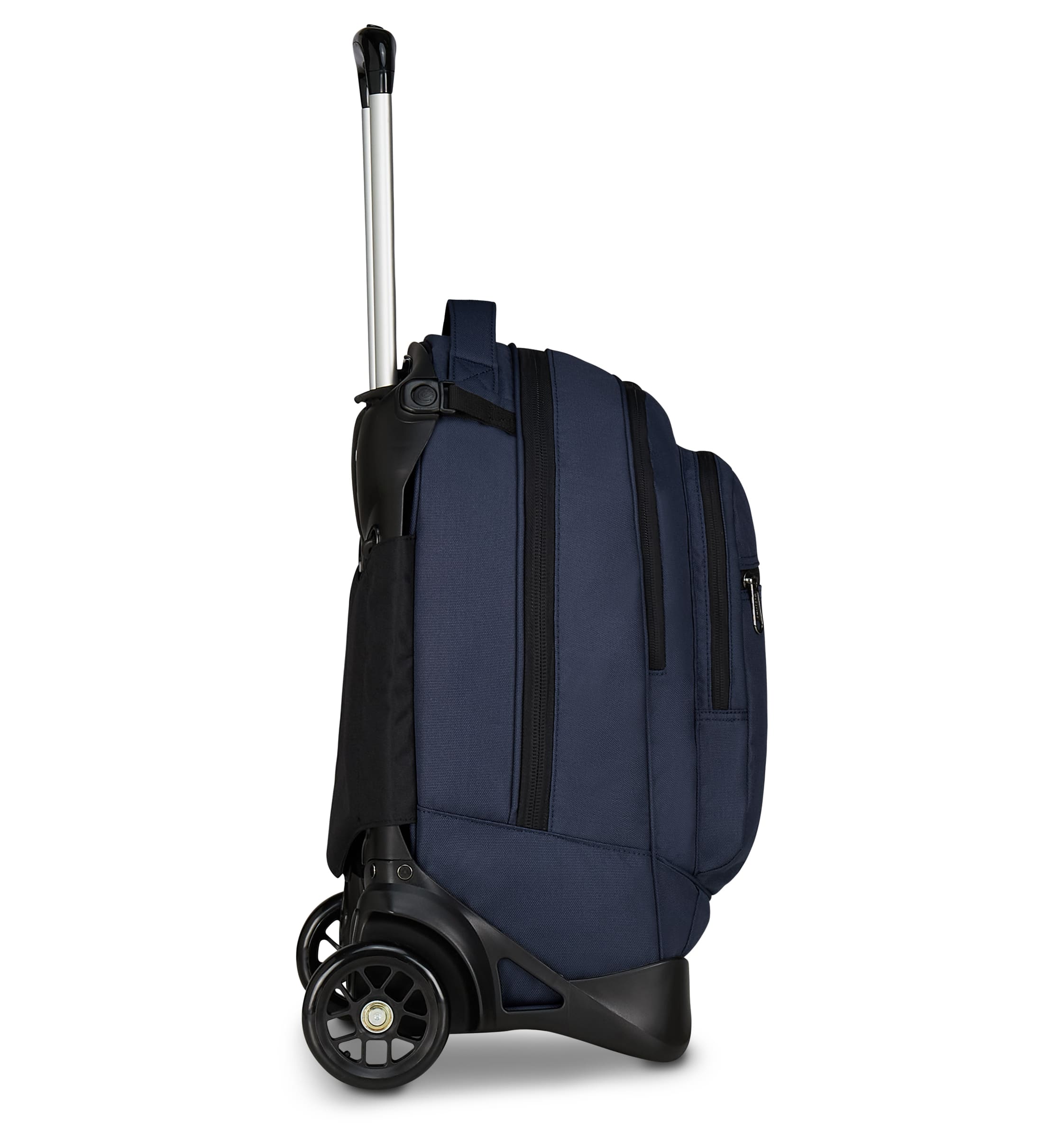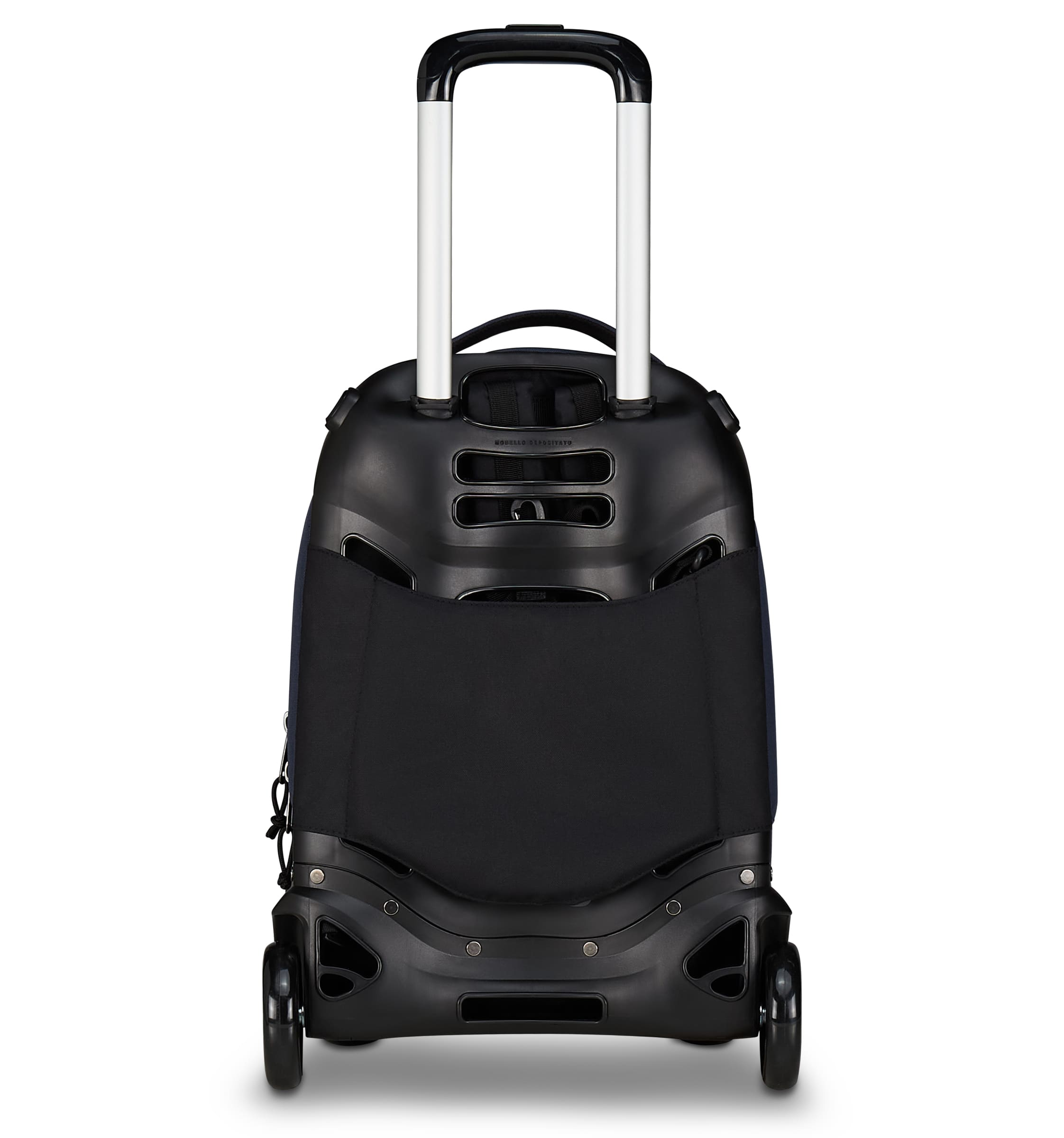 - Shockproof reinforced bottom with roll-over protection feet, 75 mm wheels, double telescopic trolley bar with double adjustment. CROSSOVER SYSTEM: The shoulder straps are automatically lifted up when it is used as trolley.