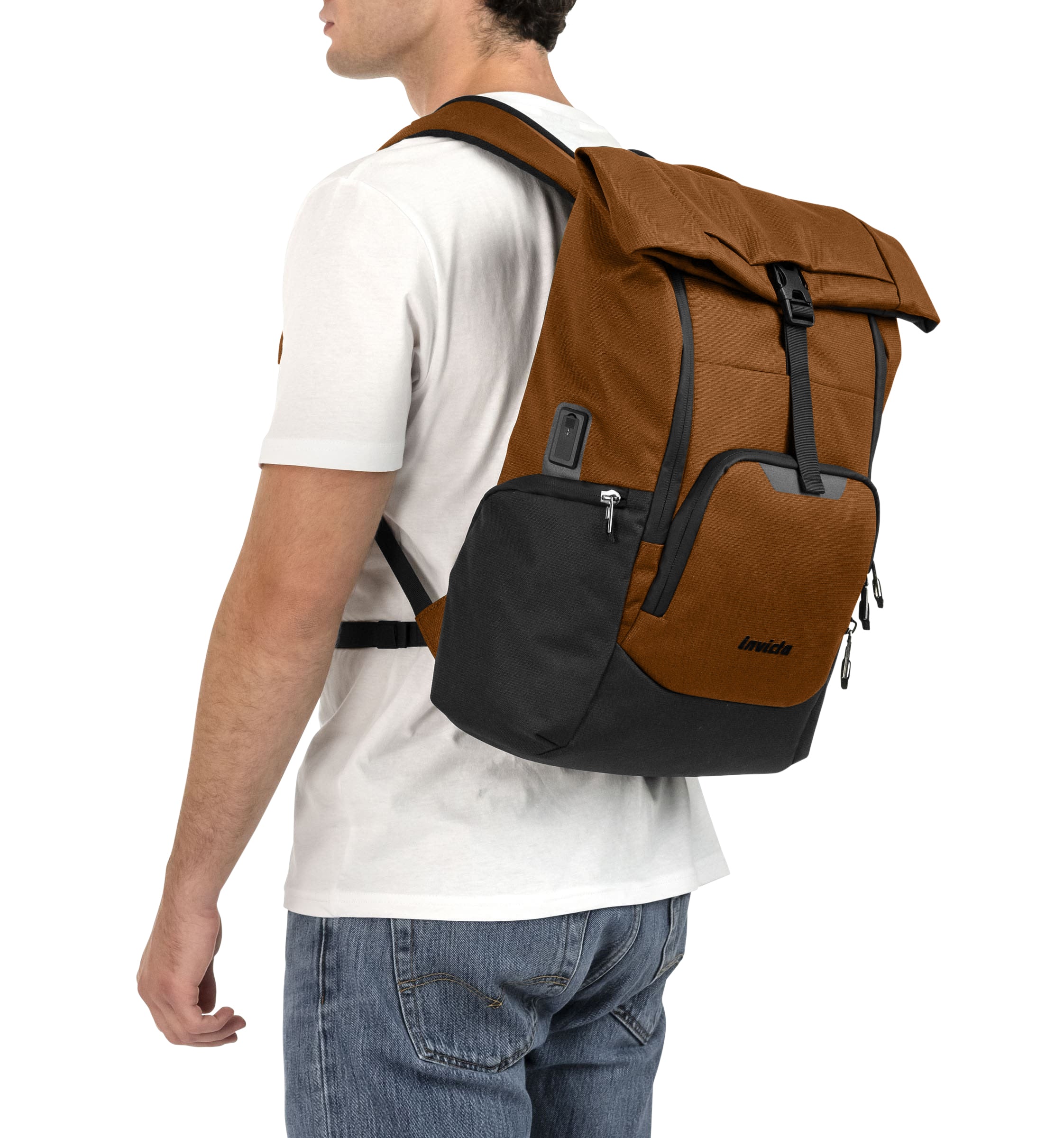 The Invict-Act Fold is a roll-top backpack with a reinforced bottom and a capacity of 24 litres. It has a practical additional front opening, a compartment for a PC up to 15.6’, pockets for tablet, water bottle, smartphone, glasses and accessories. It also allows charging of devices via a USB port on the side. Ideal for moving around the city, it can also be stored on the trolley via the special strap.