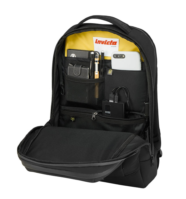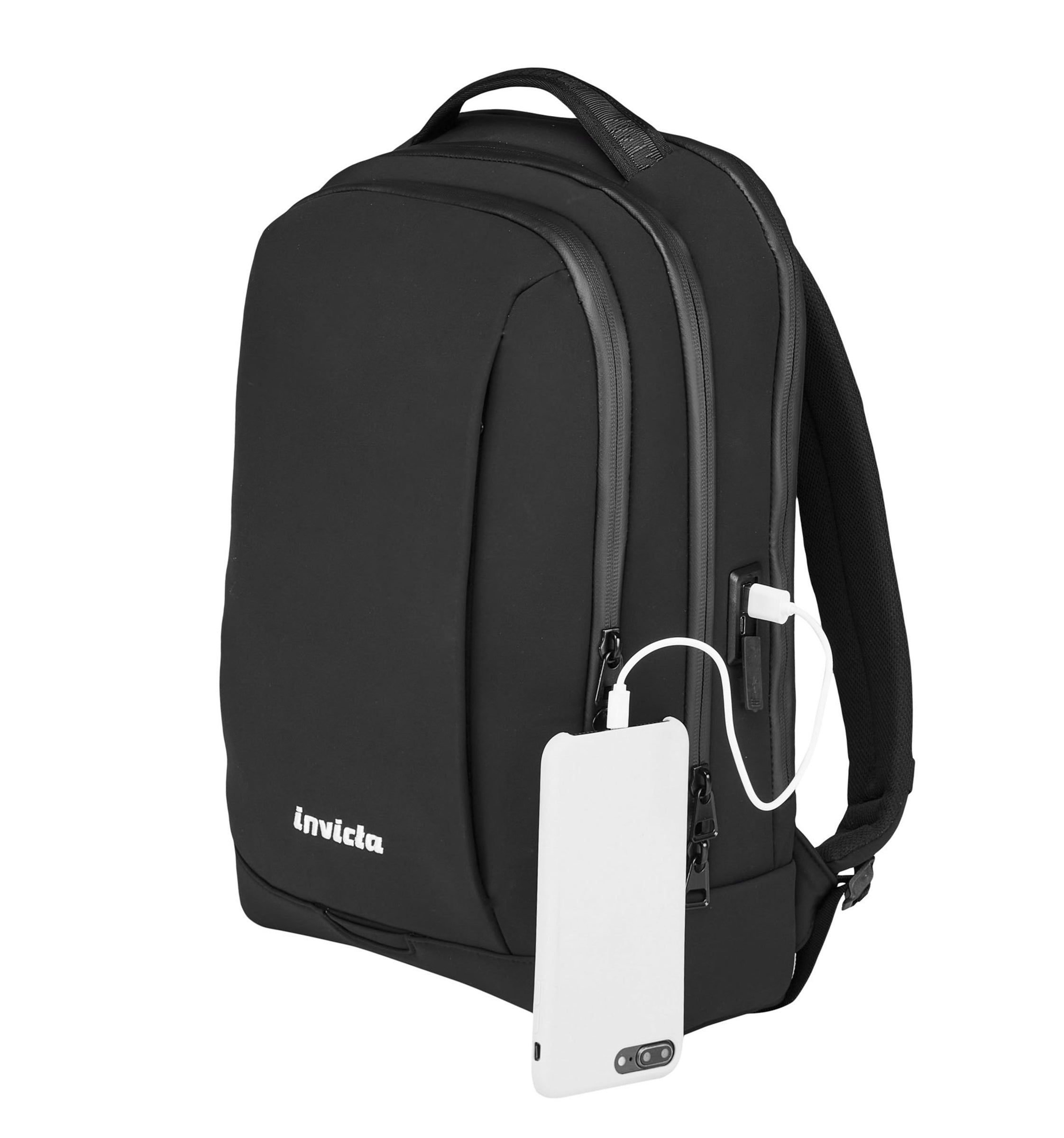 - USB adapter (powerbank not included). Removable and adjustable waist belt. Removable and adjustable chest webbing. Functional webbing for trolley bar. Invicta logo and inserts in reflective screen print. Water repellent zipper.Personalised metal zip puller with security system