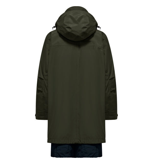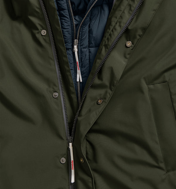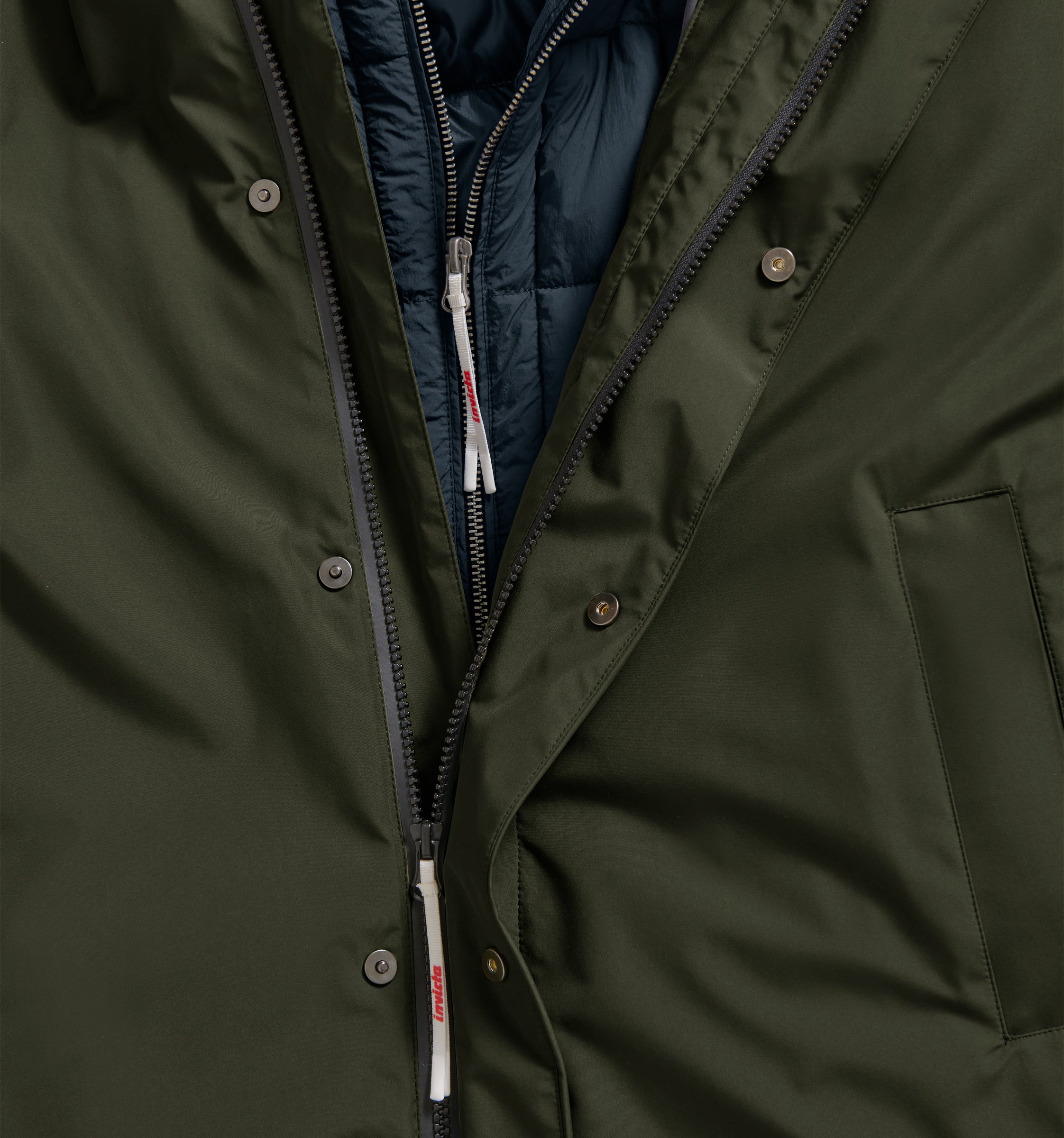 La giacca interna imbottita staccabile si attacca con cerniere nascoste e una chiusura magnetica sul cappuccio. L'imbottitura sintetica PrimaLoft® di peso medio fornisce calore e isolamento senza peso extra. Il design due in uno offre flessibilità: indossa la giacca interna da sola nei giorni più miti o combina entrambi gli strati per un calore aggiuntivo. Ogni dettaglio, dalle cuciture a prova di piuma alla finitura resistente all'acqua, garantisce funzionalità, comfort e stile duraturo.