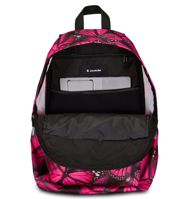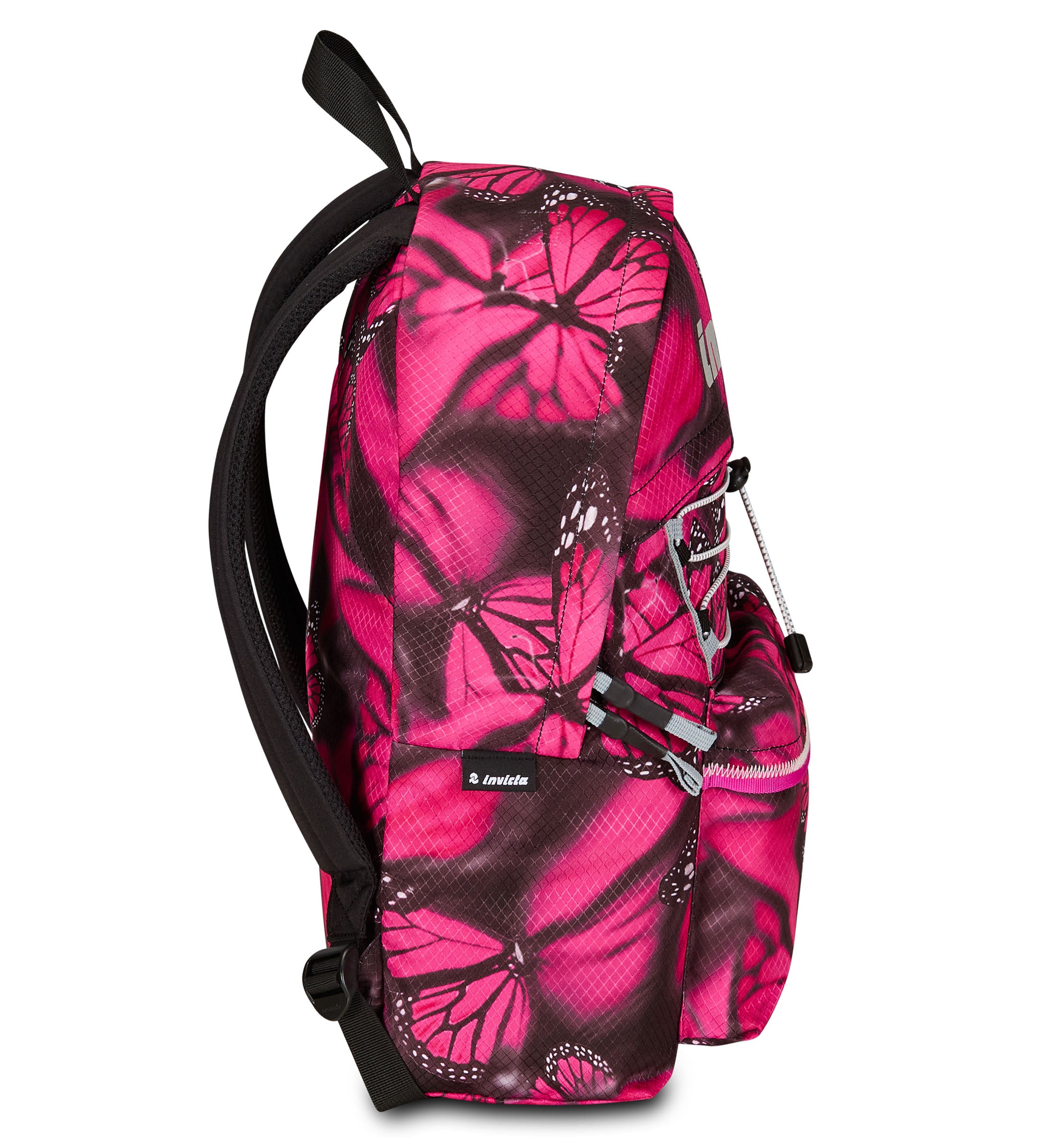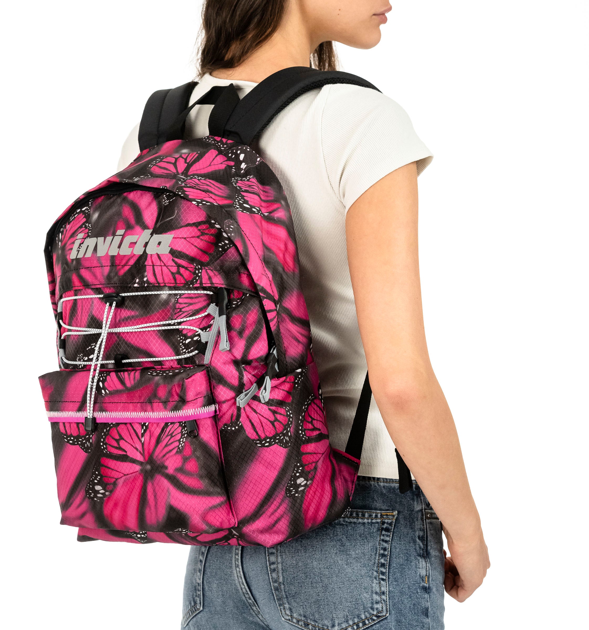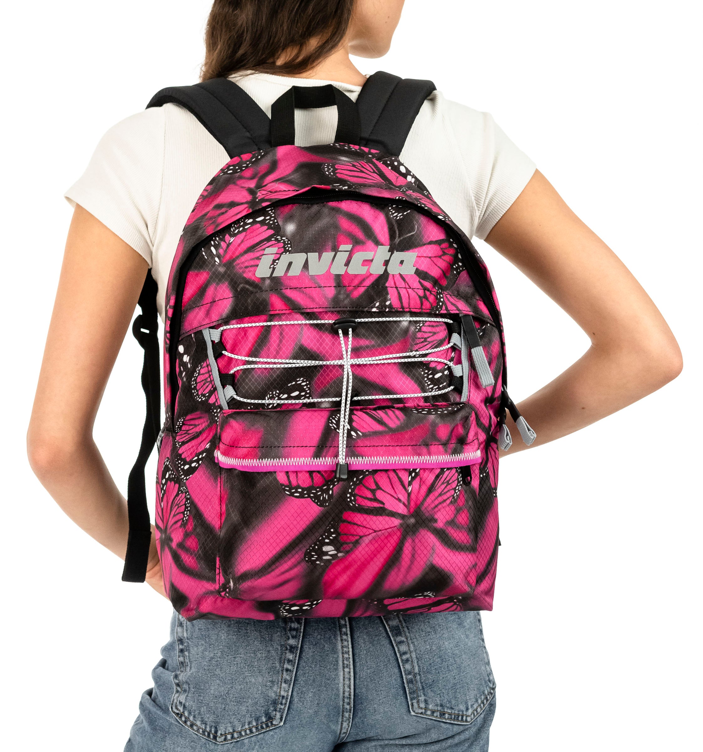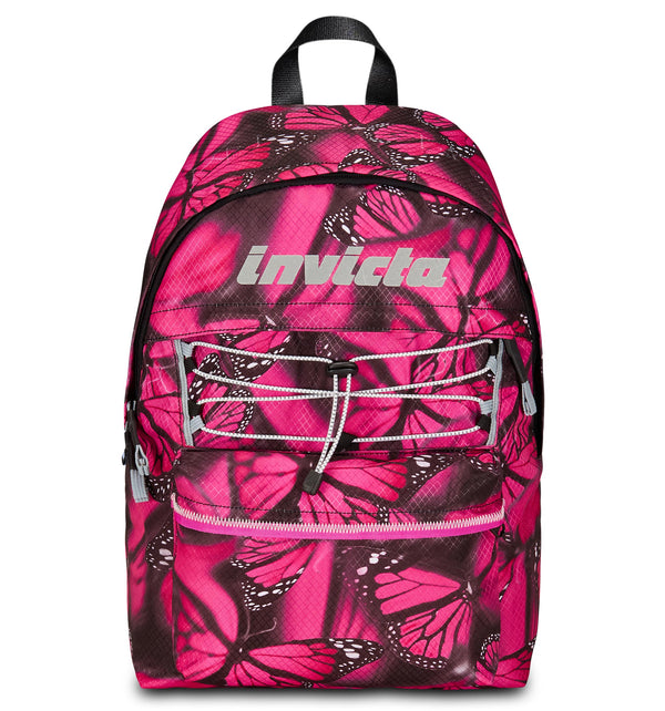 - Zaino mono scomparto con nastri laterali per la regolazione del volume, sistema elastico frontale riflettente, tirazip con nastro e logo Invicta in serigrafia riflettente.